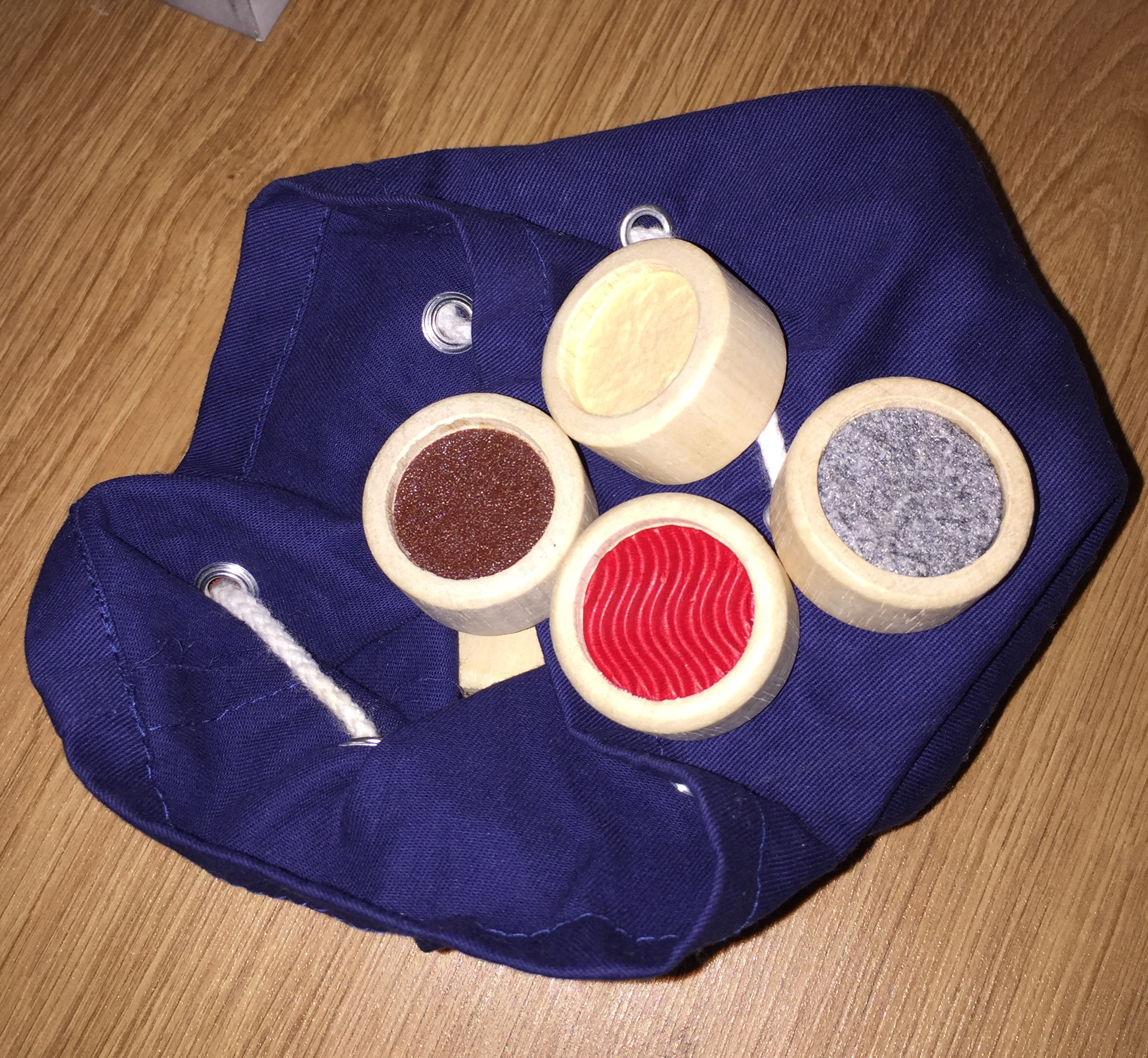 Sau nu știu cum să le spun. E un set cu pastiluțe senzoriale în perechi de câte două. Sunt vreo 20 de perechi, cred. Jocul e simplu, bagi o mână în sac și scoți o pastiluță, apoi cotrobăi să o găsești, pe pipăitelea, și pe a doua. Dar nu-i musai să vă jucați așa. E un joc potrivit și pentru bebeluși, pentru că îi stimulează tactil. Jocul e de la Goki și, din păcate, nu mai știu cum îi zice. L-am cumpărat dintr-un magazin fizic din Craiova, dar sunt convinsă că se găsește și online.